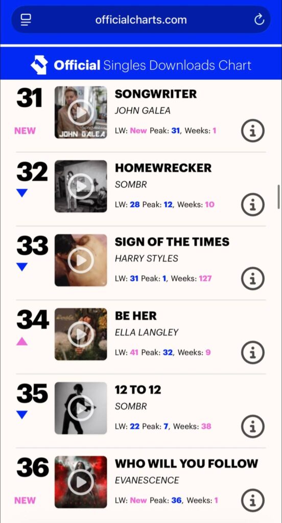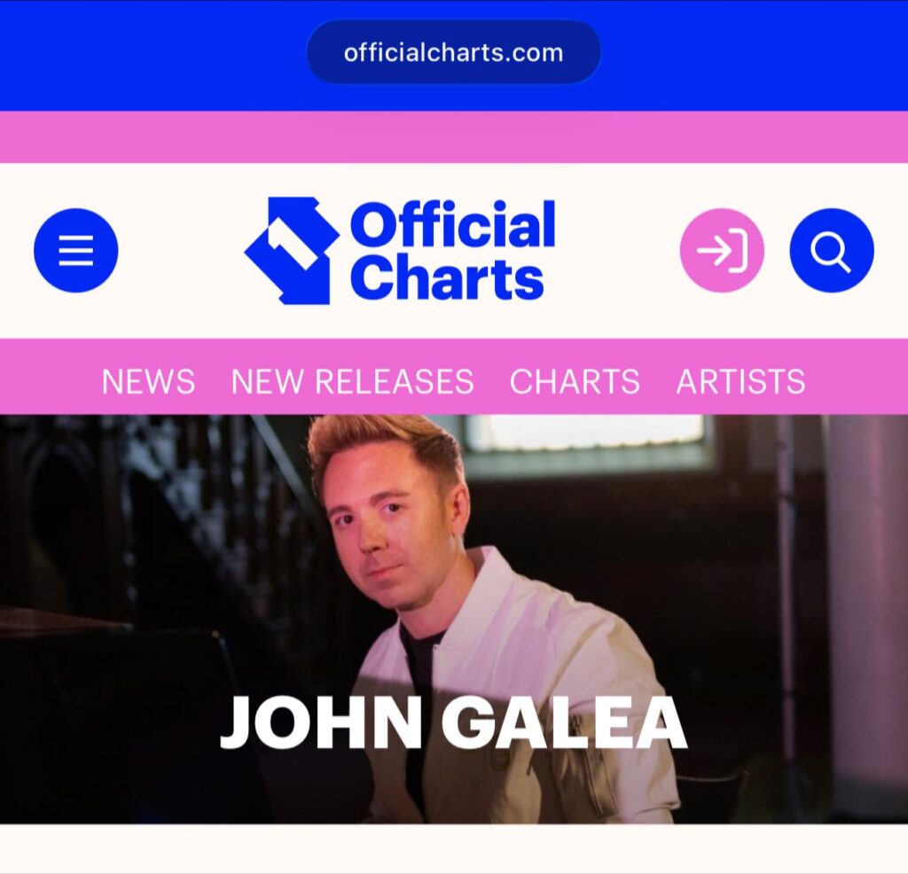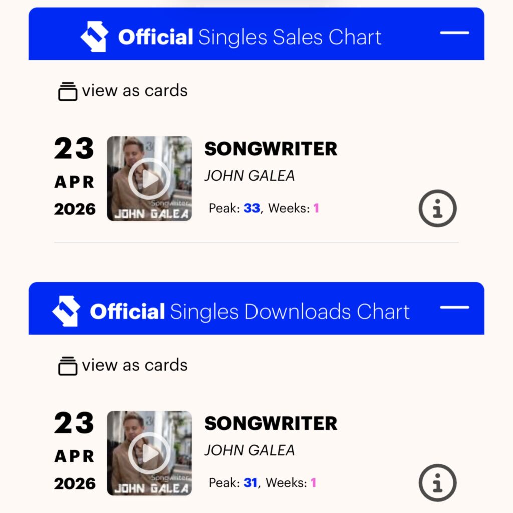 John Galea’s 1st track off his Debut Album ‘Songwriter’ has crashed into the Official Top 40 Charts at #31 , making John an Official Top 40 Charting Artist. The track which, has been described as ‘direct, emotional piece’ by Galore Magazine who premiered the Official Music video shot in Central London.
